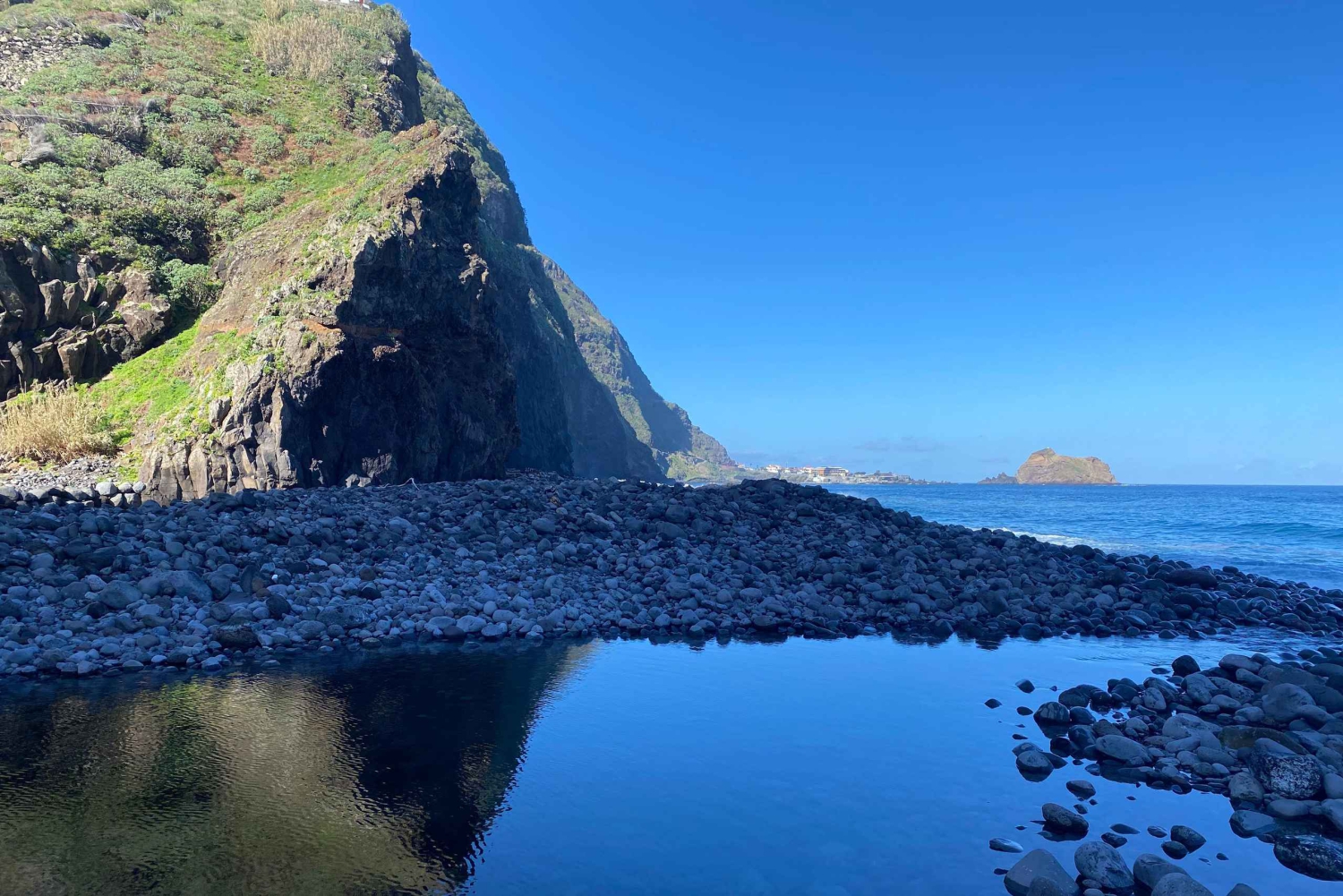 Kontynuując podróż do Ribeira da Janela, podziwiaj dramatyczne formacje skalne wyrastające z oceanu, wyjątkowy widok wzdłuż surowego wybrzeża Madery. Następnie dotrzyj do Porto Moniz, słynącego z naturalnych basenów wulkanicznych, w których można zanurzyć się w krystalicznie czystych wodach Atlantyku otoczonych czarną lawą.